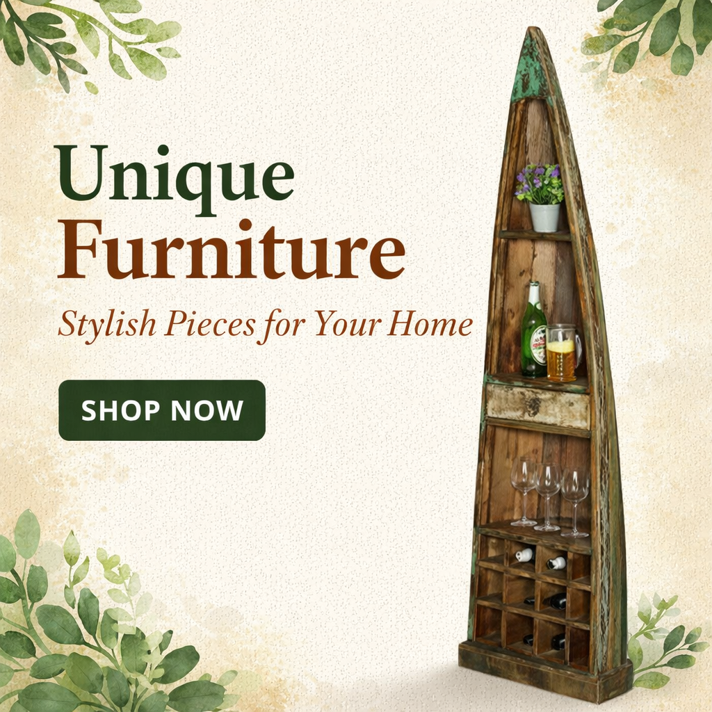 From vintage cabinets, wine racks, shelves, and storage units to distinctive décor furniture, every product reflects authentic Rajasthani craftsmanship and attention to detail. The natural grains, weathered finishes, and antique styling make each piece truly one of a kind.